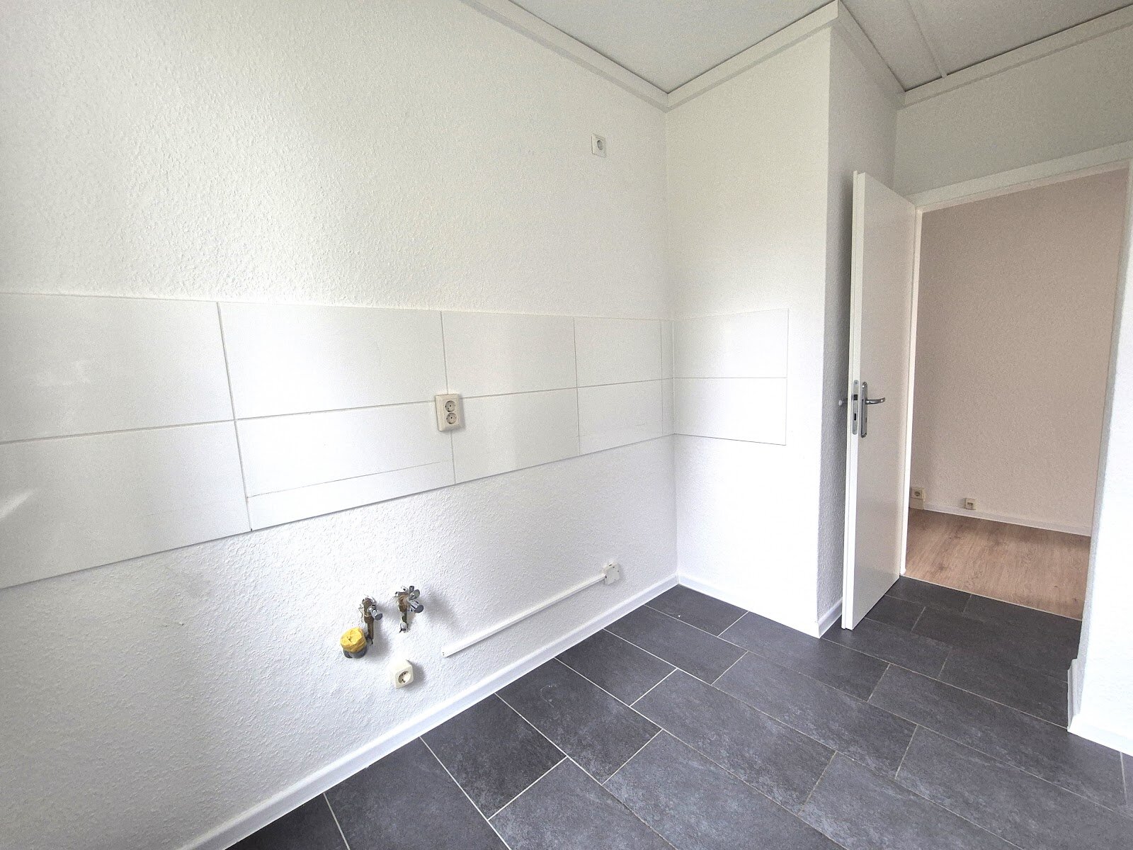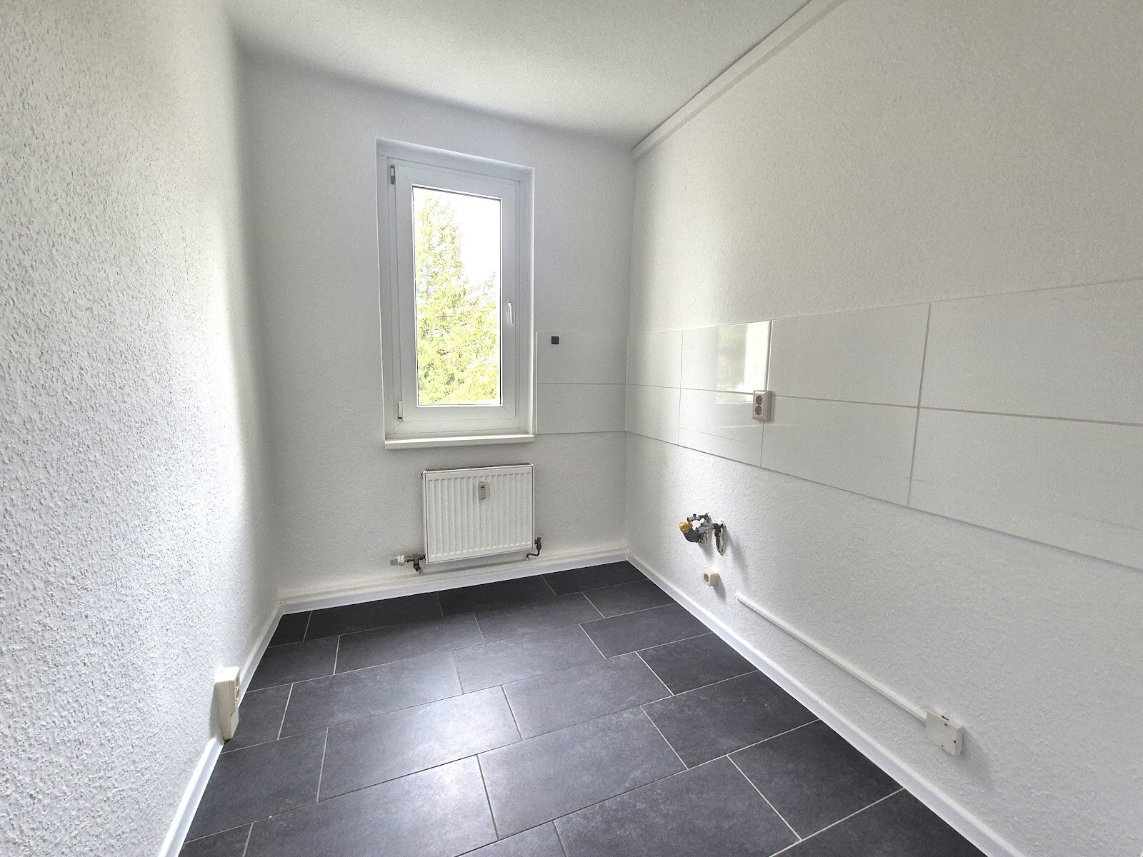 - Anthrazite Boden- und weiße Wandfliesen in der Küche