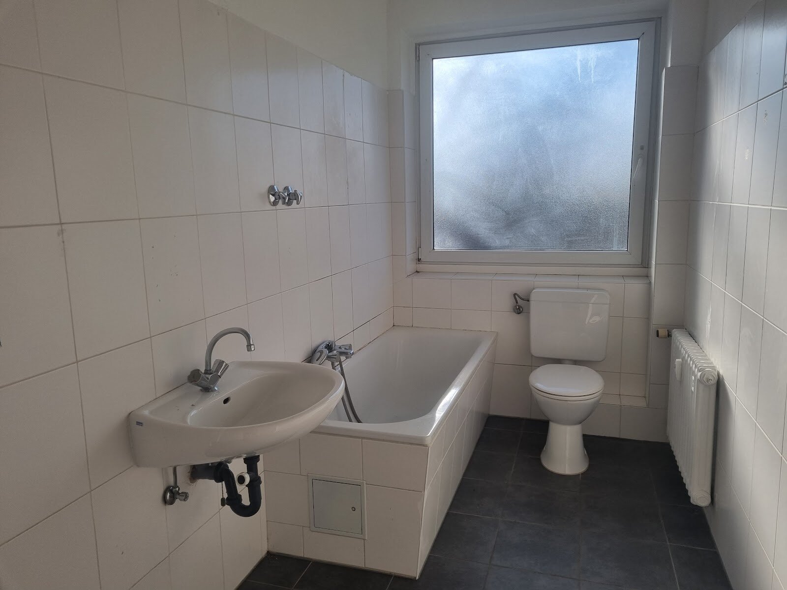 - Anthrazite Boden- und weiße Wandfliesen im Bad