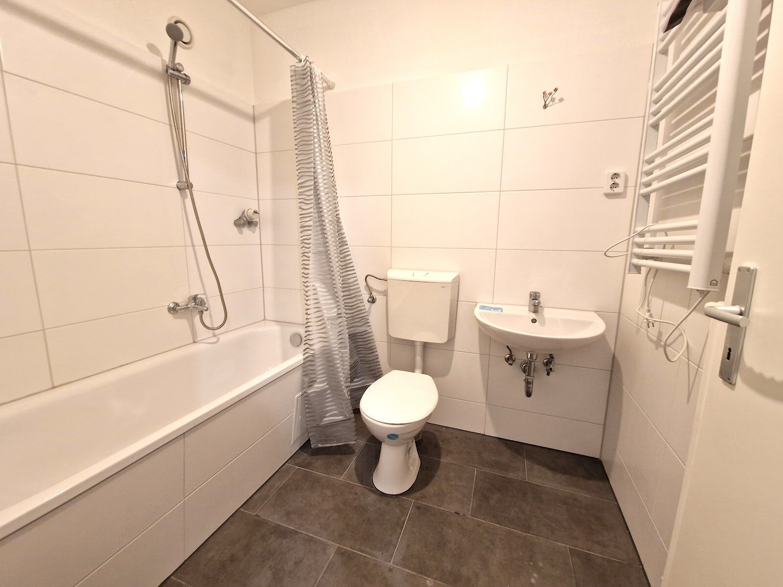- Anthrazite Boden- und weiße Wandfliesen im Bad