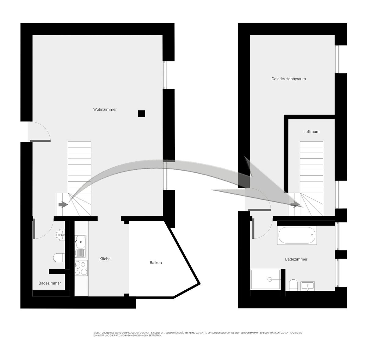 Die großzügige 1-Zimmer-Wohnung erstreckt sich über rund 80 m². Auf der unteren Ebene liegen der Wohn- und Schlafbereich sowie die Küche, während die darüberliegende Galerieebene perfekten Raum für Hobbys oder kreative Gestaltungsideen bietet.