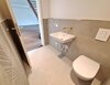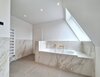Großformatige, moderne Marmor-Fliesen in zeitloser Gestaltung unterstreichen den hochwertigen Charakter der Sanitärräume.