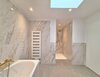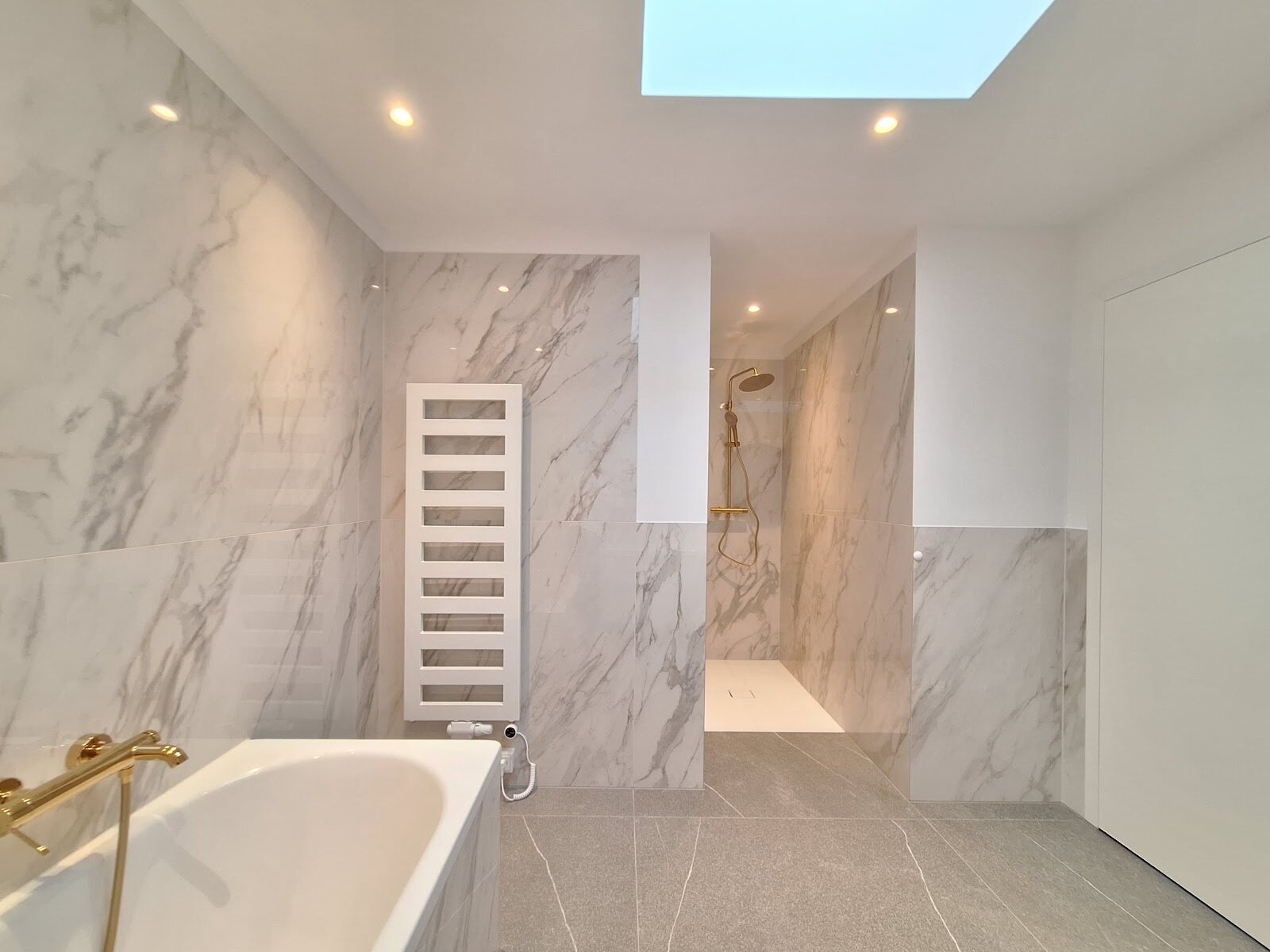 Großformatige, moderne Marmor-Fliesen in zeitloser Gestaltung unterstreichen den hochwertigen Charakter der Sanitärräume.