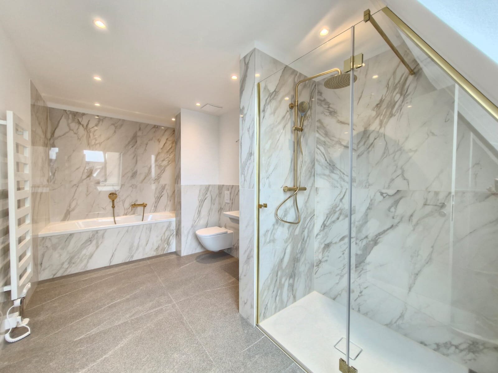 Ausgewählte Markenprodukte in hochwertiger Verarbeitung bieten Komfort und Langlebigkeit – ergänzt durch stilvolle Details wie Wandarmaturen und Handtuchheizkörpern.