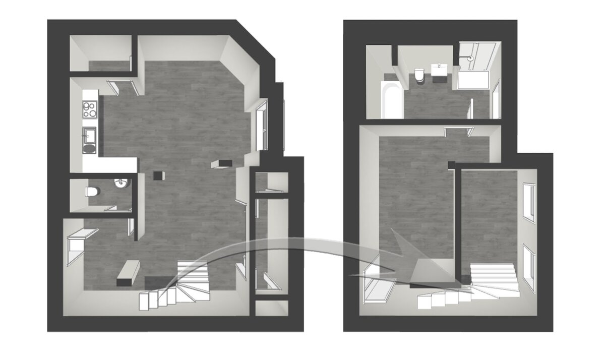 Die großzügige 1-Zimmer-Wohnung erstreckt sich über rund 80 m². Auf der unteren Ebene liegen der Wohn- und Schlafbereich sowie die Küche, während die darüberliegende Galerieebene perfekten Raum für Hobbys oder kreative Gestaltungsideen bietet.