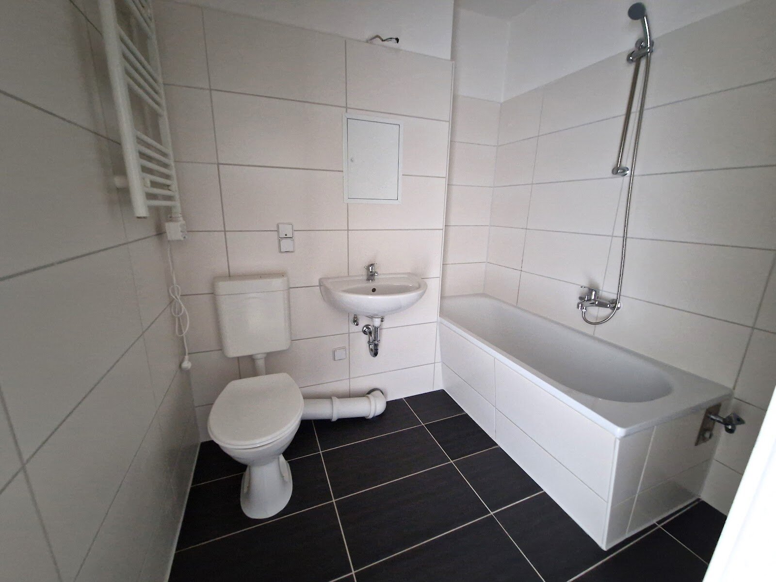 - Anthrazite Boden- und weiße Wandfliesen im Bad