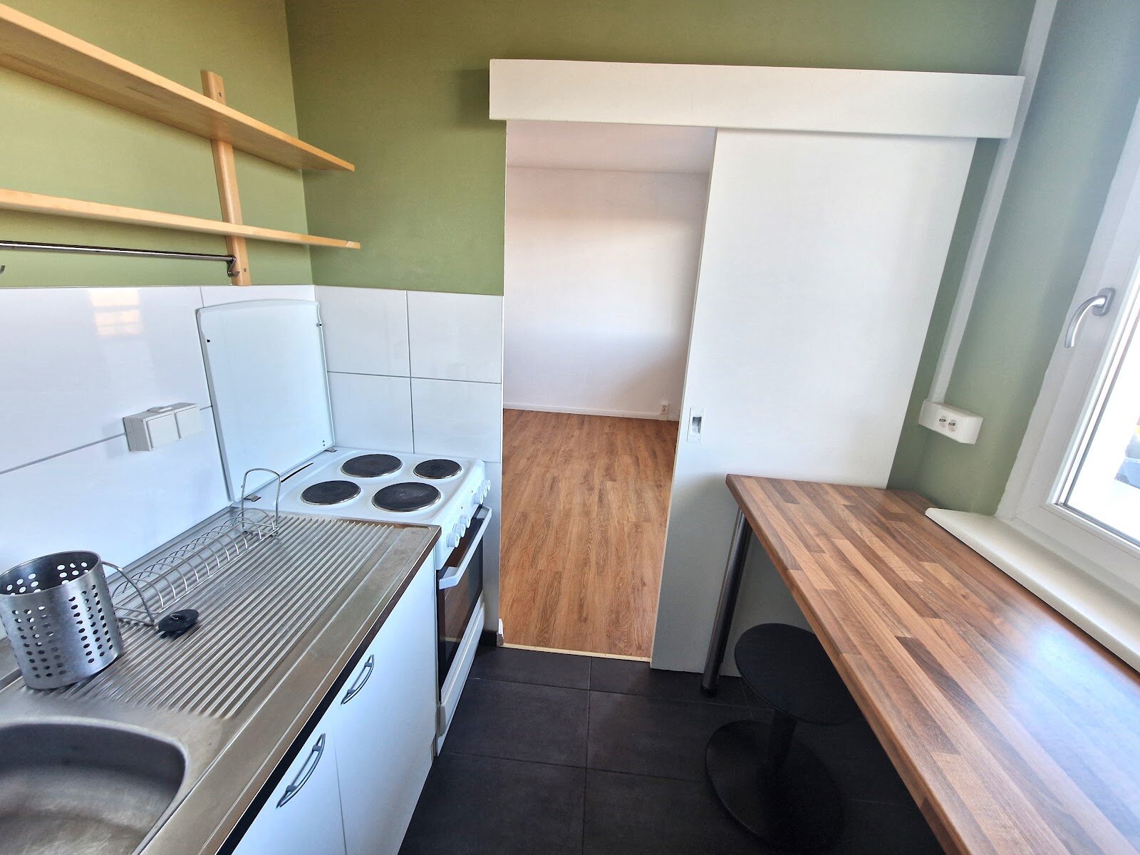 - Anthrazite Boden- und weiße Wandfliesen in der Küche