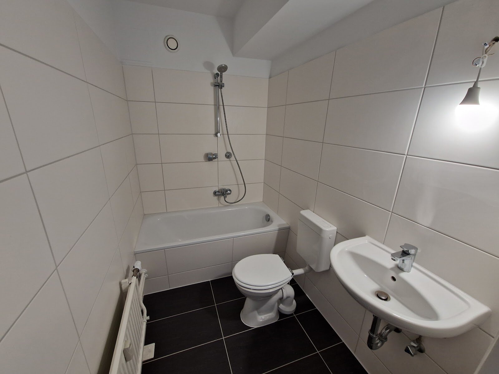 - Anthrazite Boden- und weiße Wandfliesen im Bad