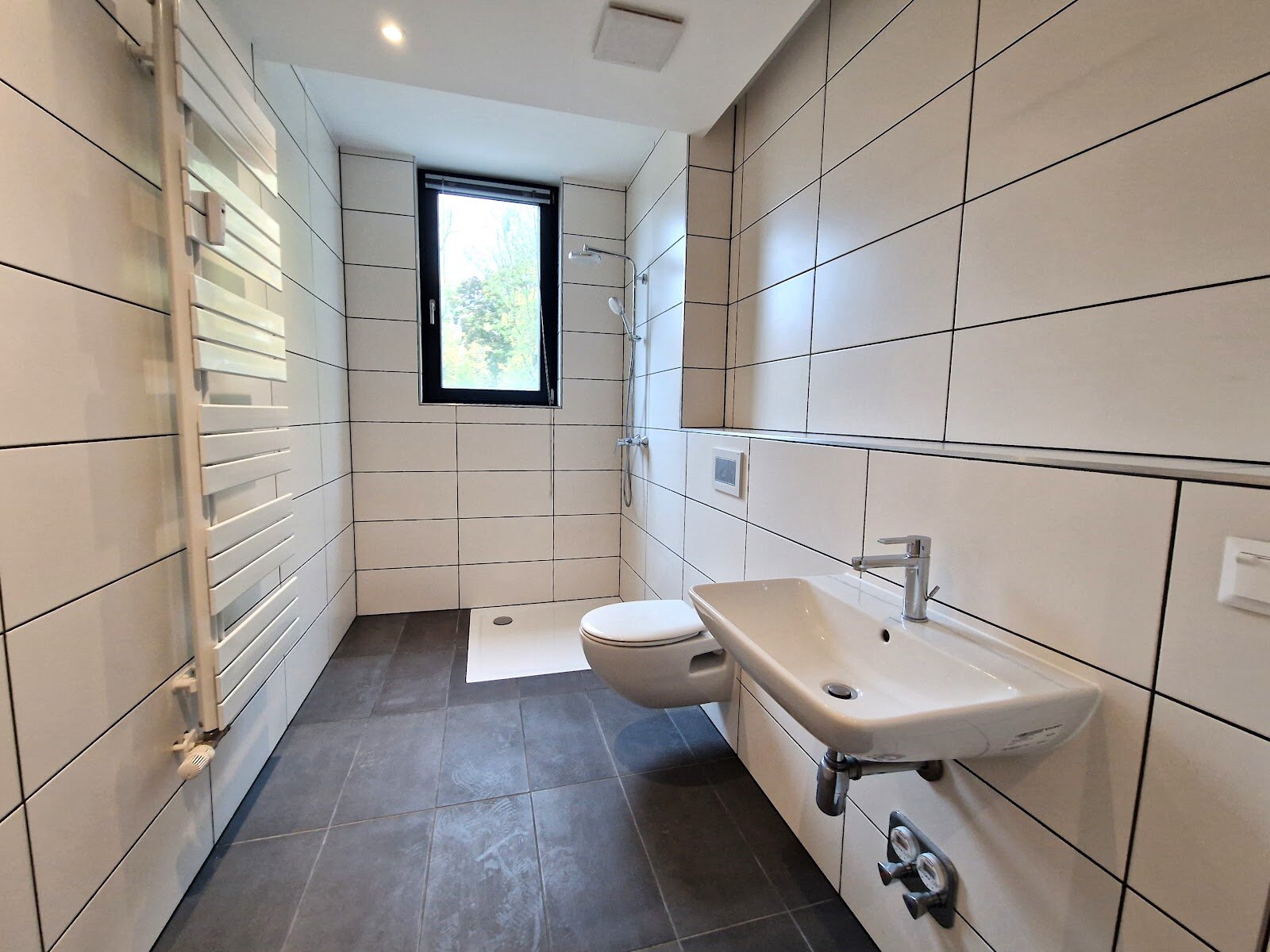 - Anthrazite Boden- und weiße Wandfliesen im Bad