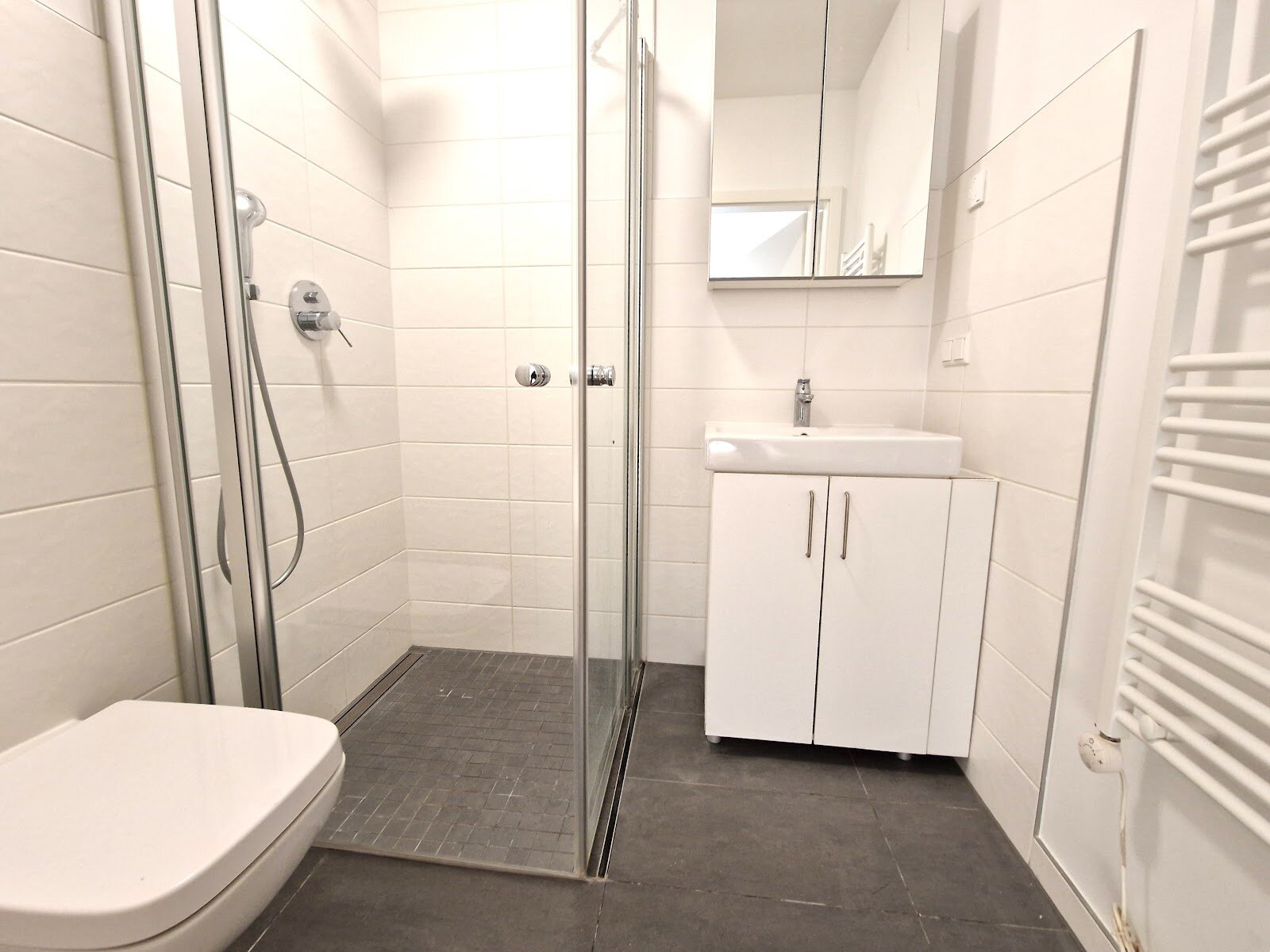 - Anthrazite Boden- und weiße Wandfliesen im Bad