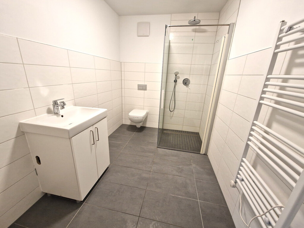 - Anthrazite Boden- und weiße Wandfliesen im Bad