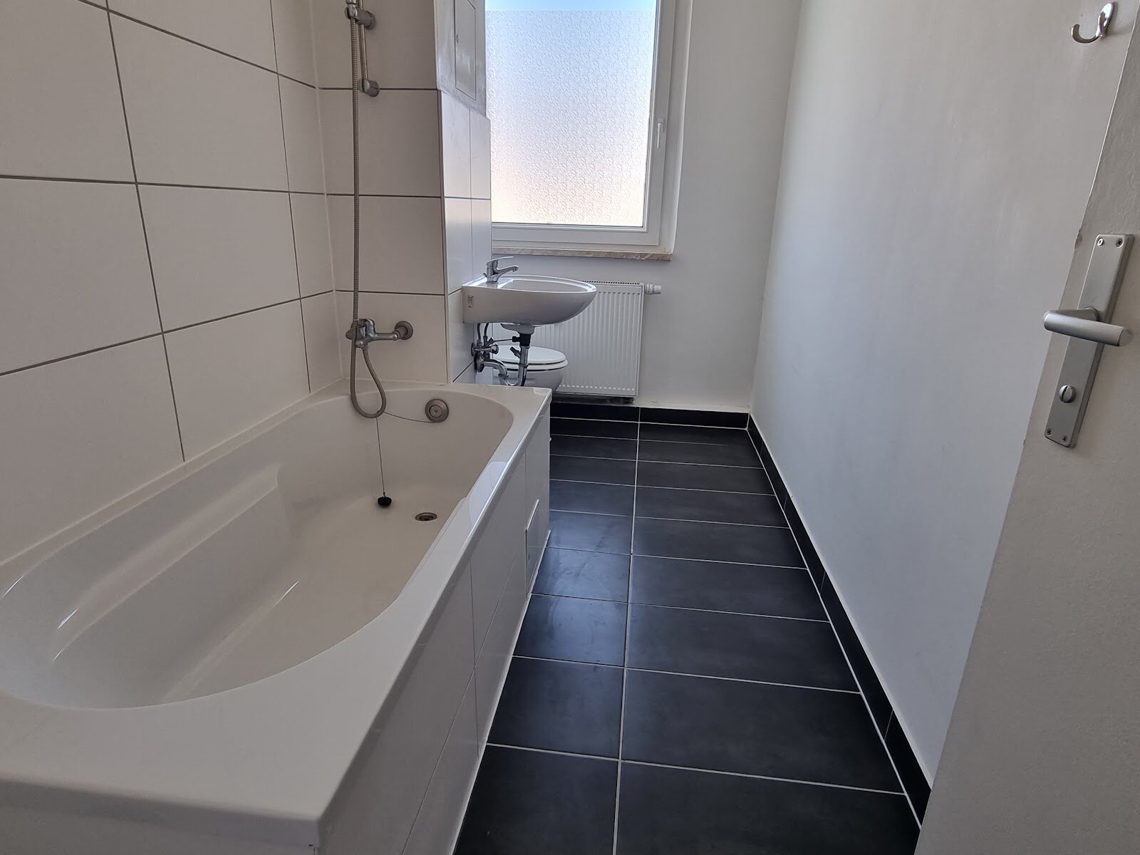 - Anthrazite Boden- und weiße Wandfliesen im Bad