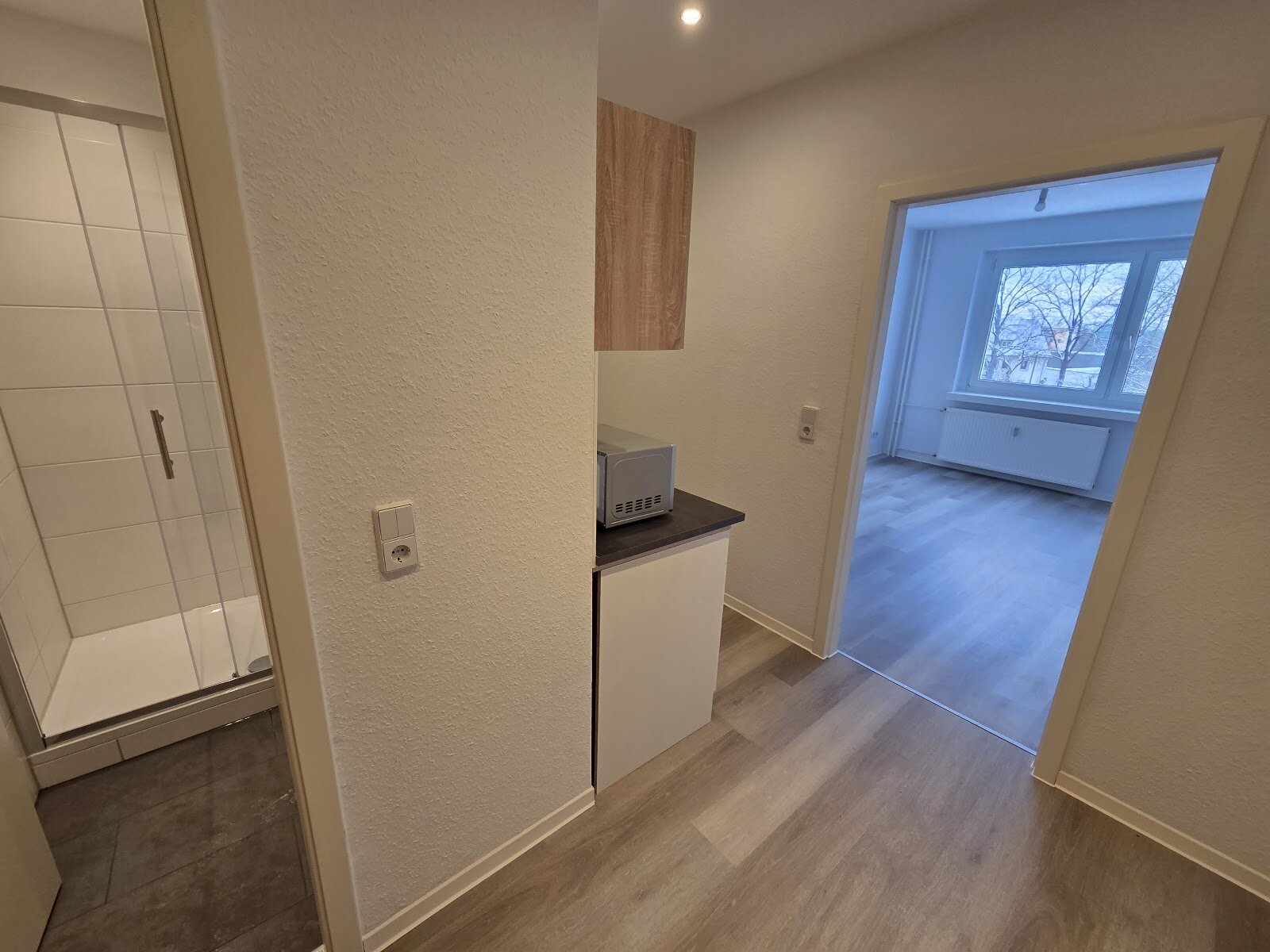 - PVC- Bodenbelag und Raufasertapete in den Wohnräumen