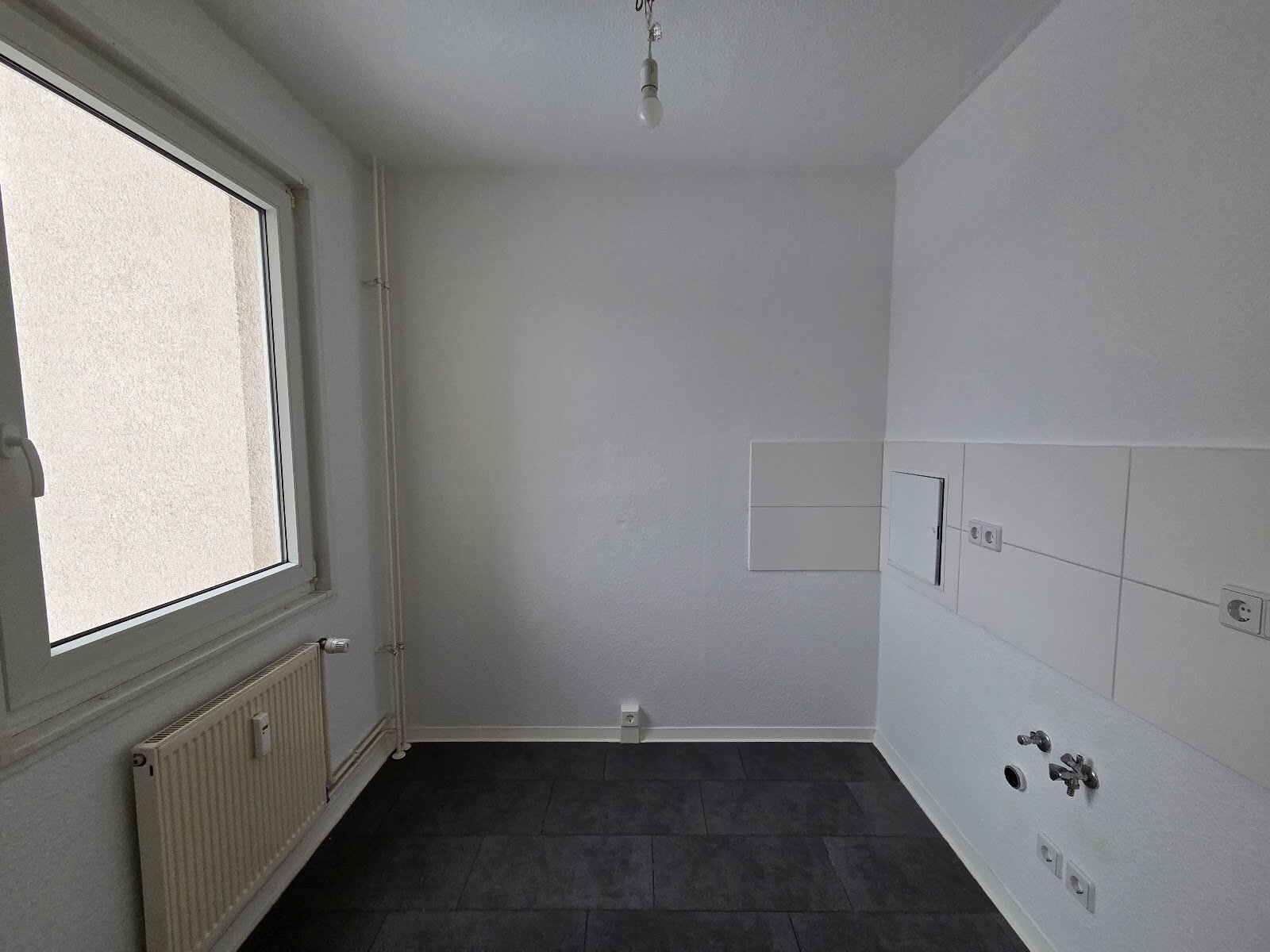- Anthrazite Boden- und weiße Wandfliesen in der Küche