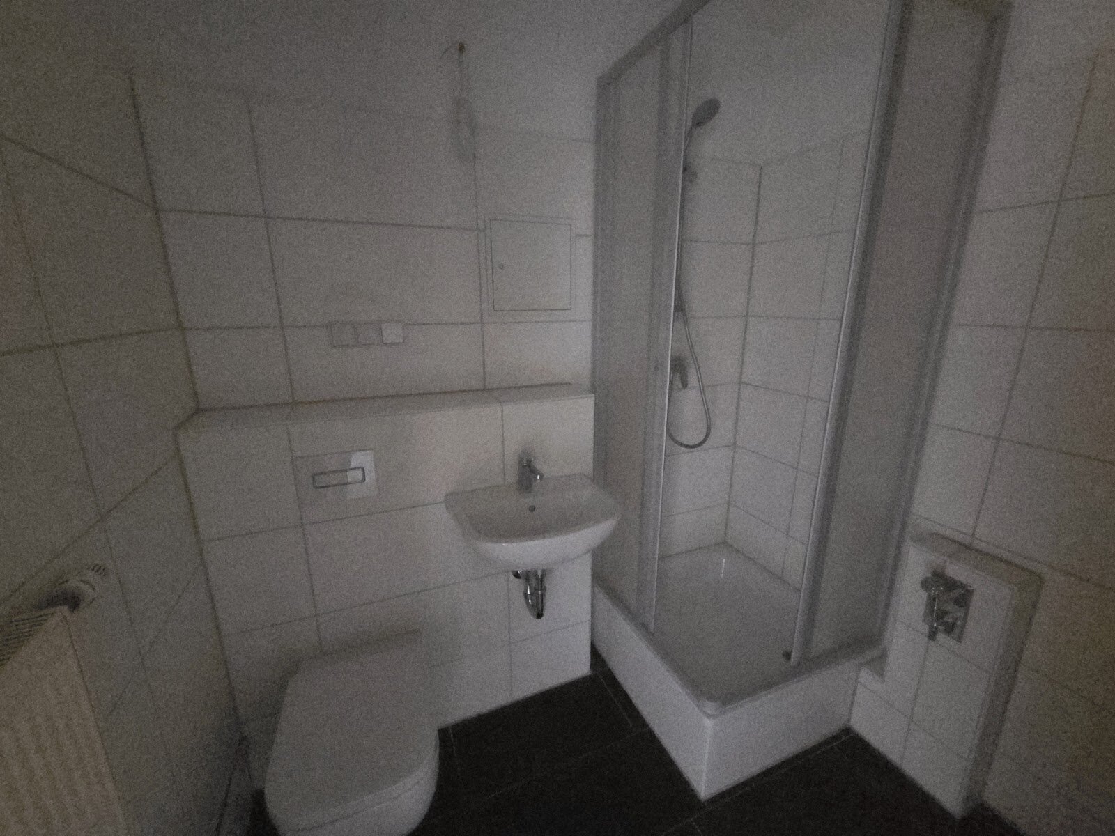 - Anthrazite Boden- und weiße Wandfliesen im Bad