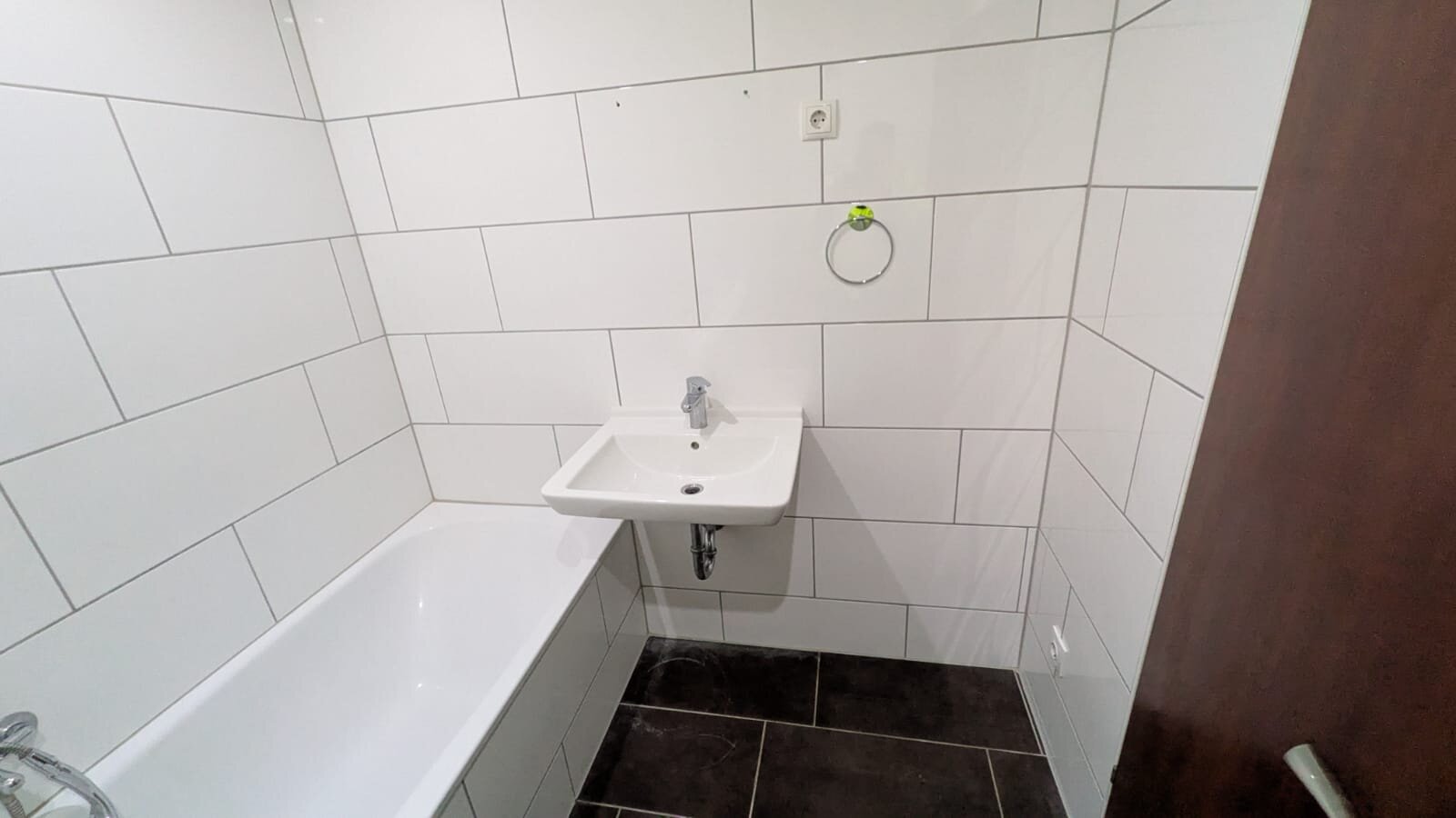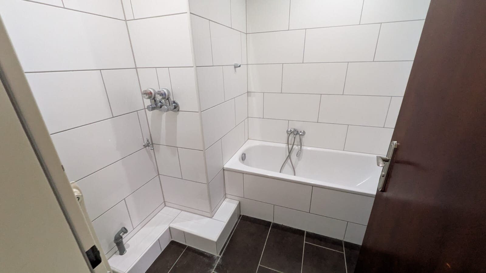 - Anthrazite Boden- und weiße Wandfliesen im Bad
