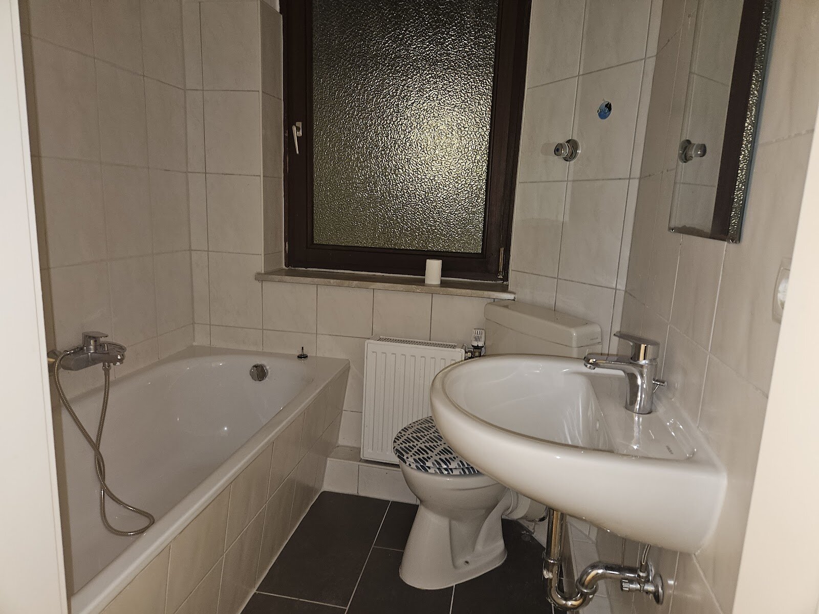 - Anthrazite Boden- und weiße Wandfliesen im Bad