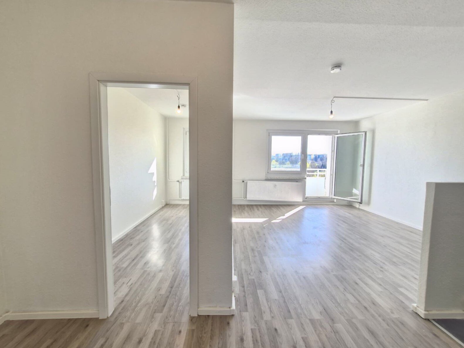 - Laminat- Bodenbelag und Raufasertapete in den Wohnräumen