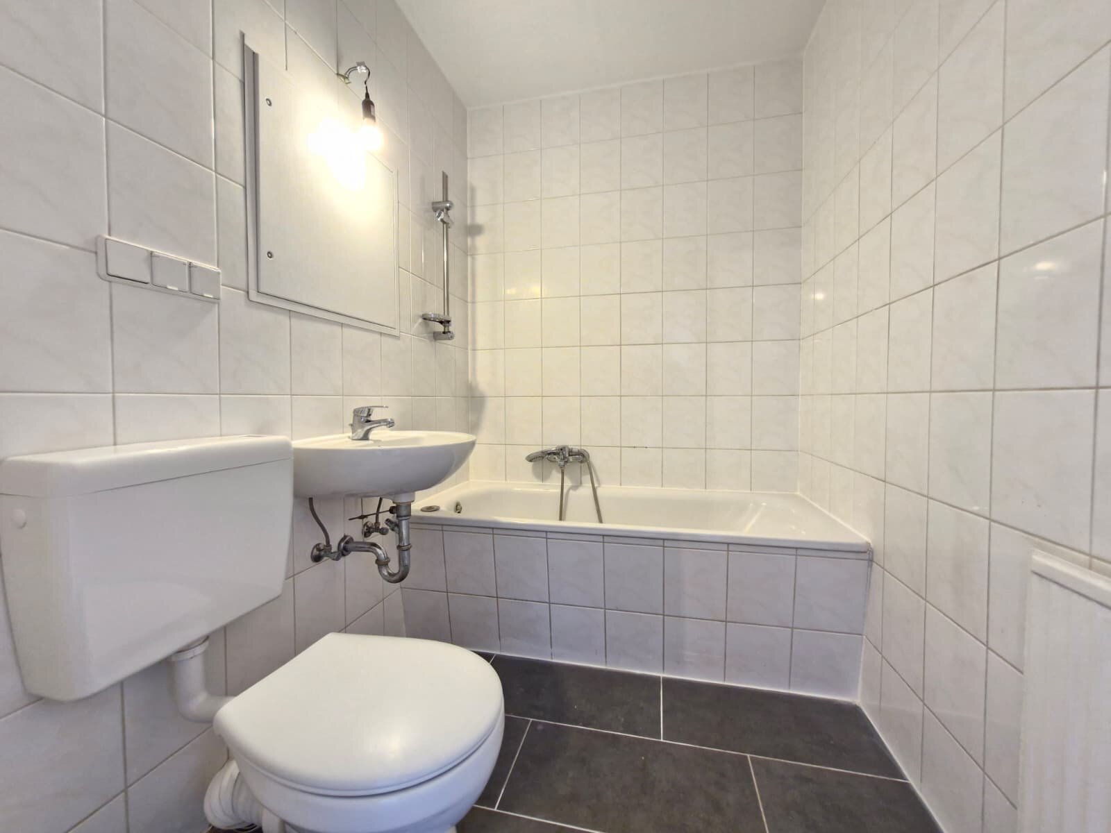 - Anthrazite Boden- und weiße Wandfliesen im Bad