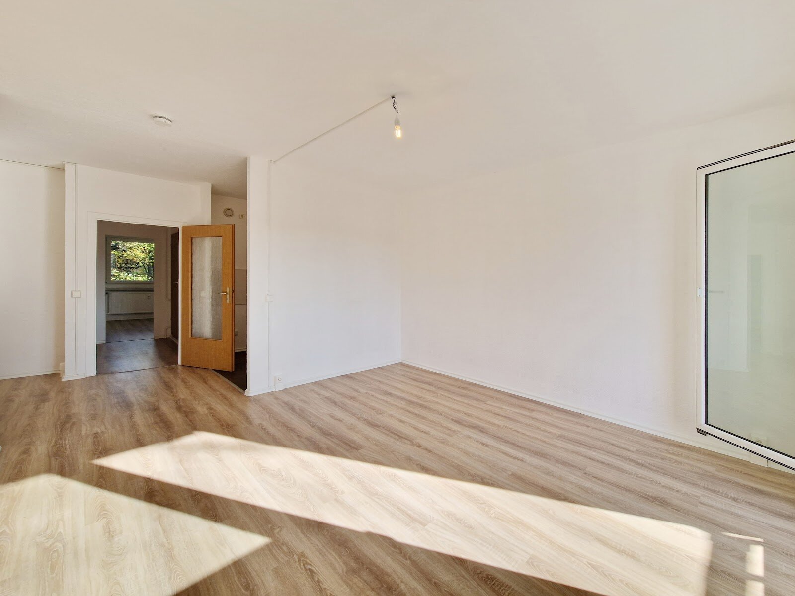 - Laminat- Bodenbelag und Raufasertapete in den Wohnräumen
