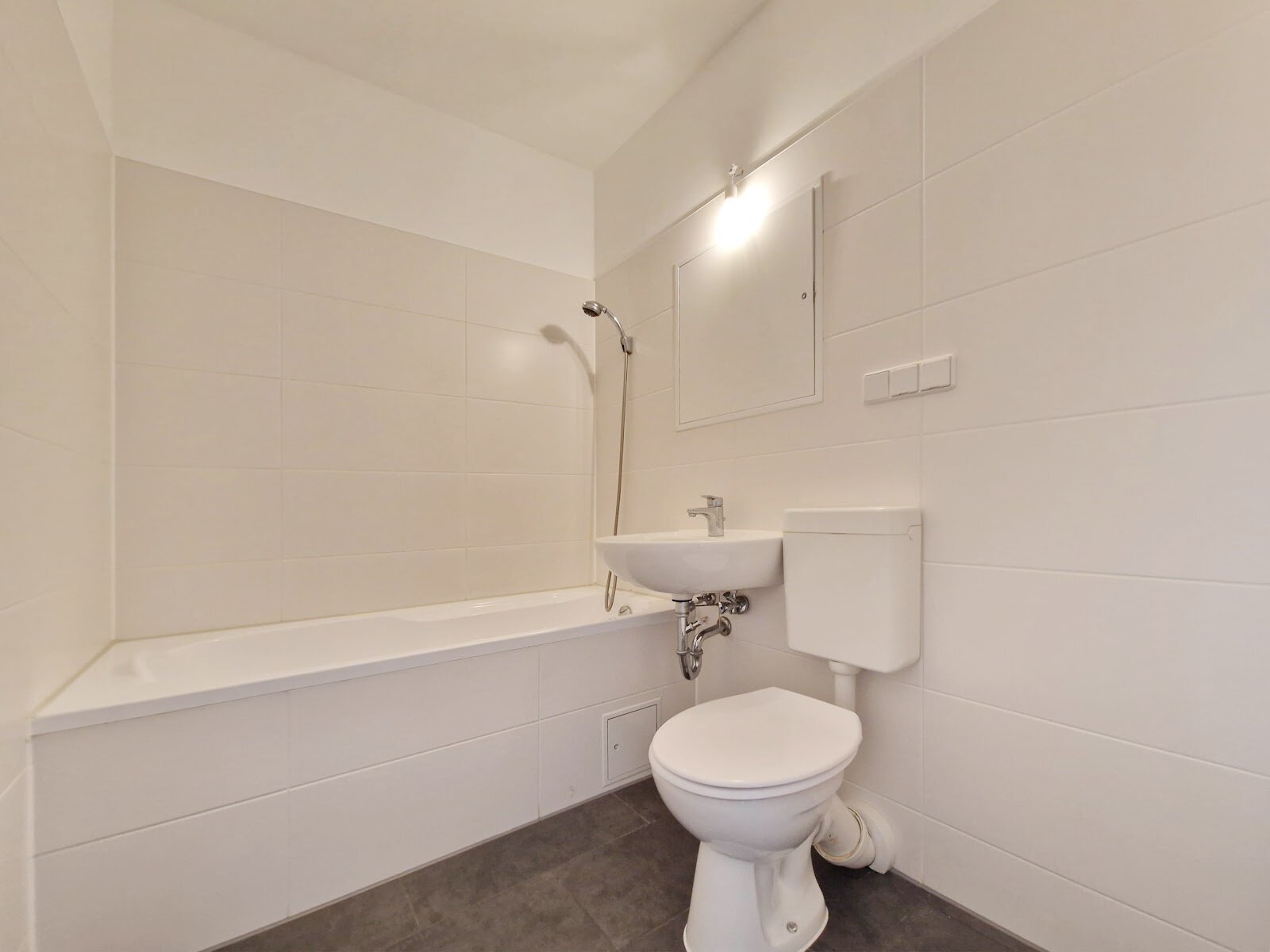 - Anthrazite Boden- und weiße Wandfliesen im Bad