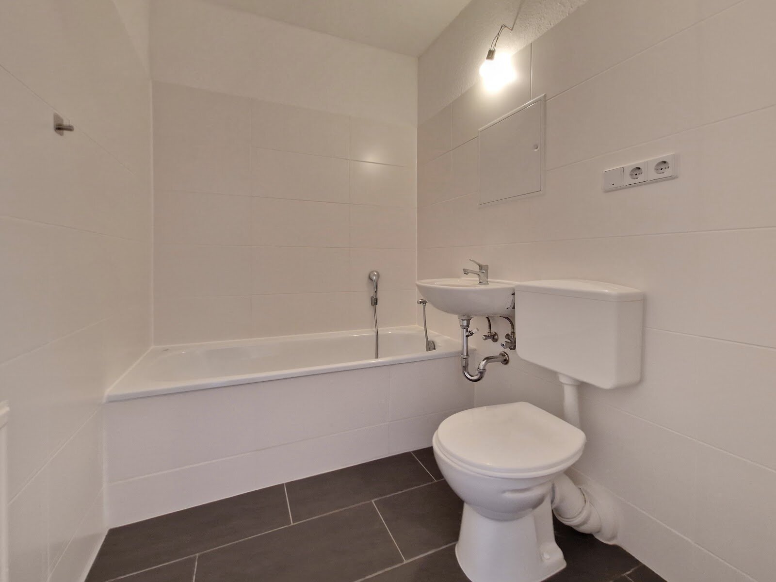 - Anthrazite Boden- und weiße Wandfliesen im Bad