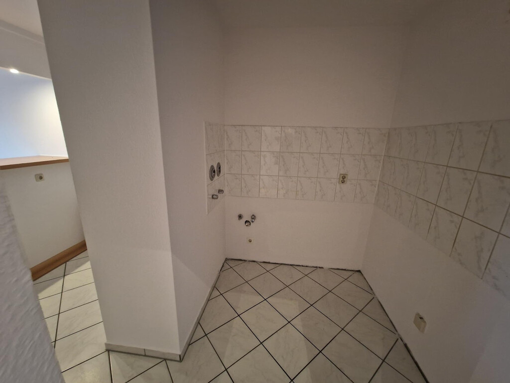- Helle Boden- und weiße Wandfliesen in der Küche