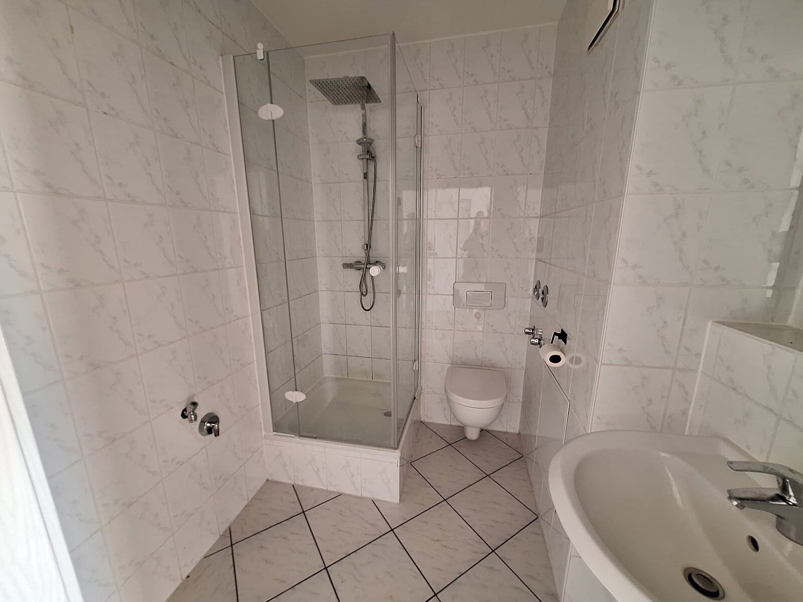 - Helle Boden- und weiße Wandfliesen im Bad