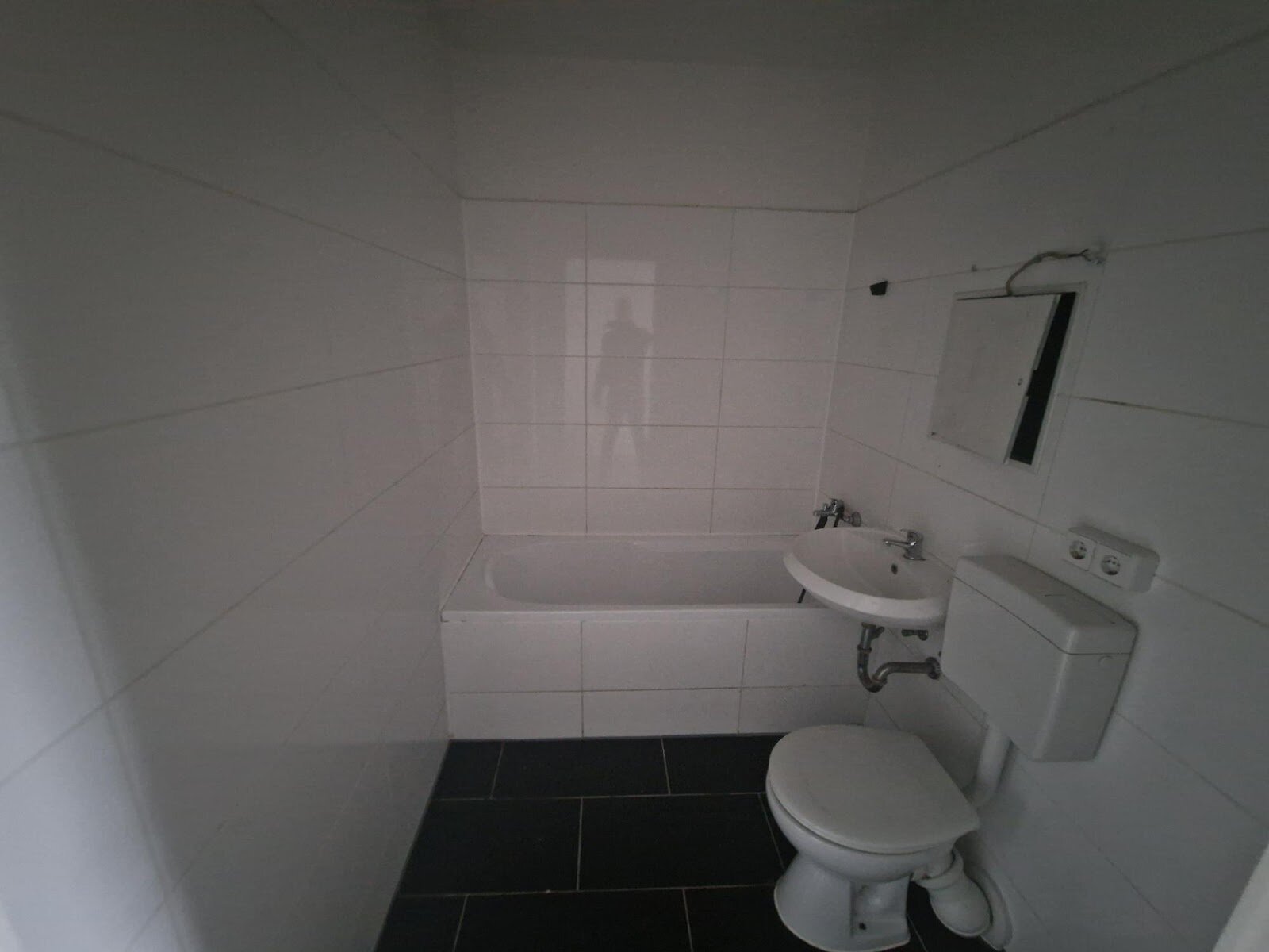 - Anthrazite Boden- und weiße Wandfliesen im Bad