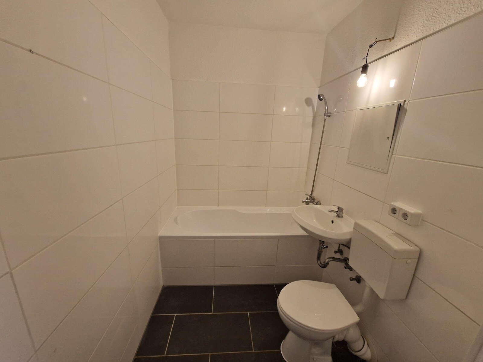 - Anthrazite Boden- und weiße Wandfliesen im Bad