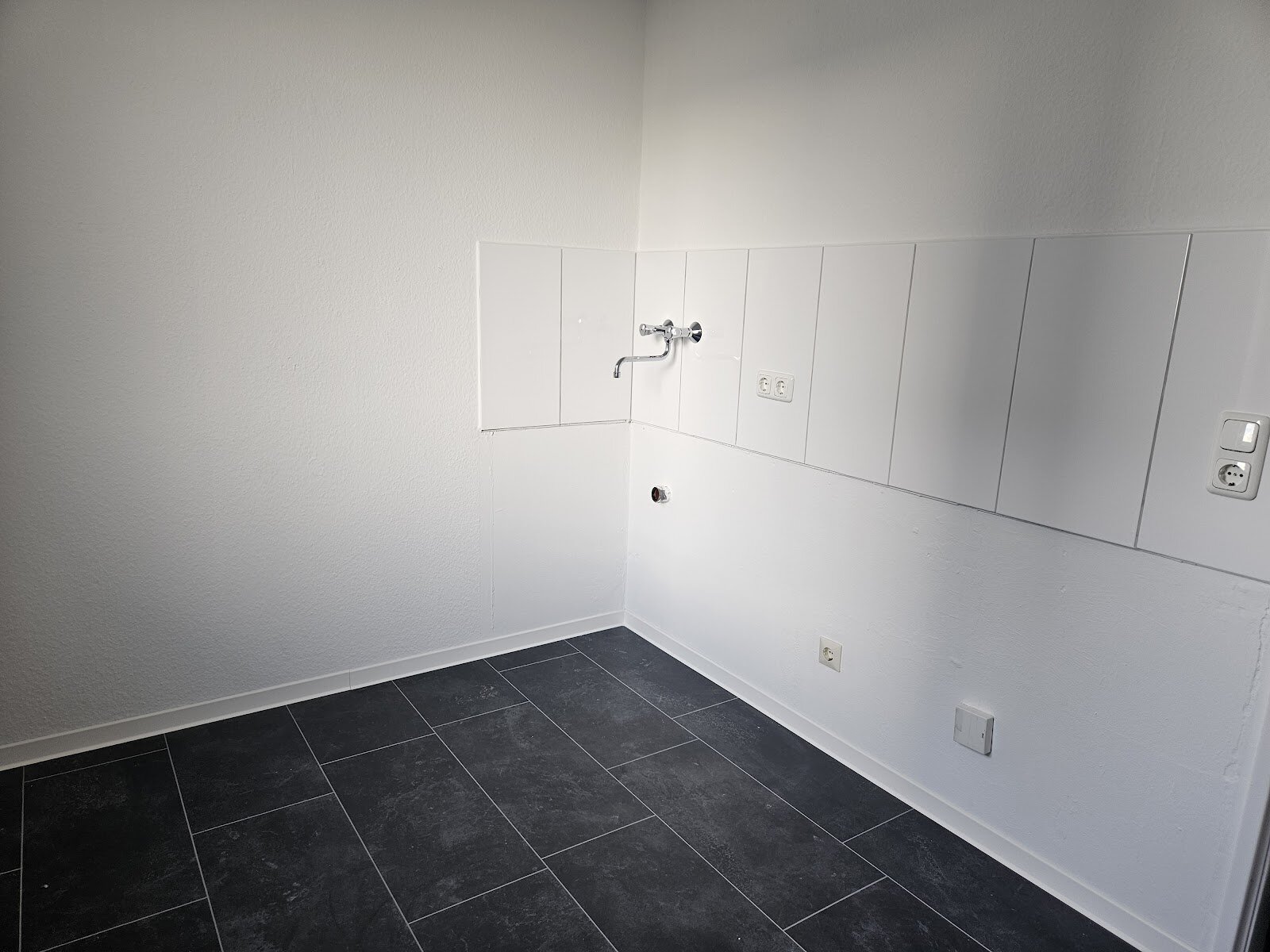 - Anthrazite Boden- und weiße Wandfliesen in der Küche