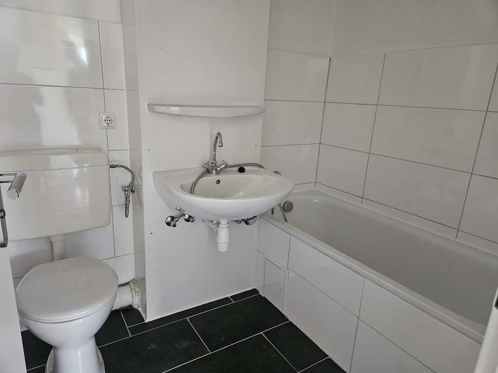 - Anthrazite Boden- und weiße Wandfliesen im Bad