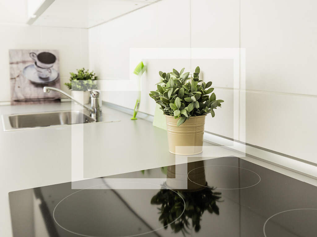 • Separate Küche mit anthrazitfarbenen Boden- und weißen Wandfliesen – Platz zum Kochen, Vorbereiten und Genießen