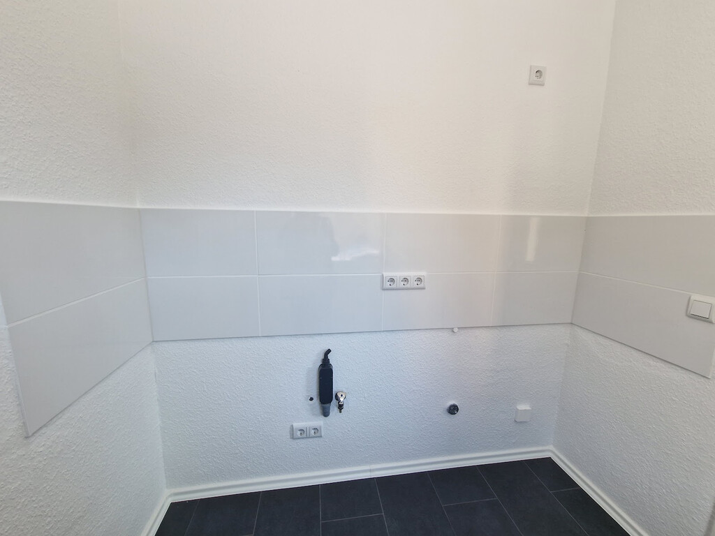 - Anthrazitfarbene Boden- und weiße Wandfliesen in der Küche