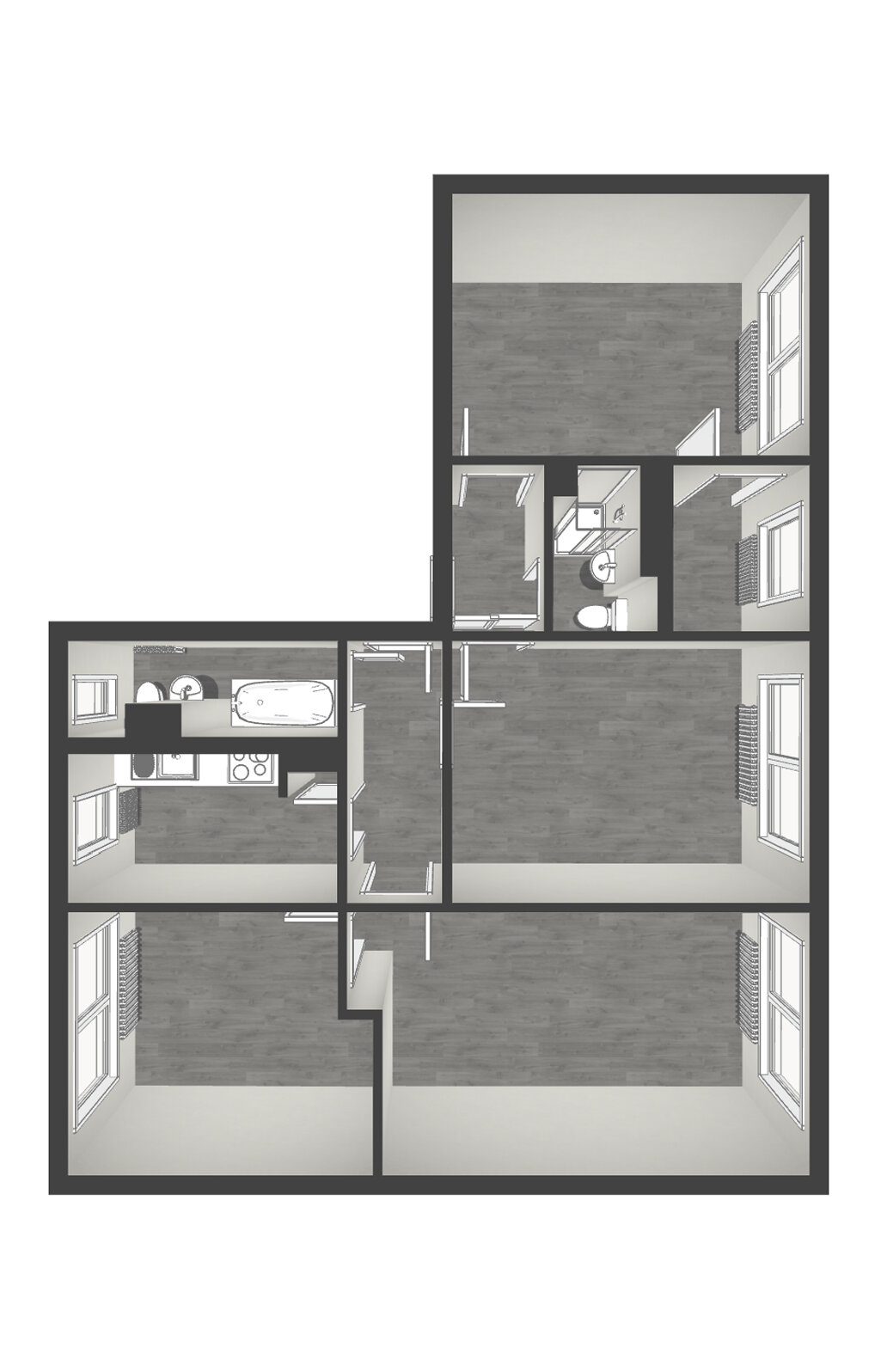 - 2 Bäder, ein Tageslichtbad mit Badewanne und ein innenliegendes Bad mit Dusche