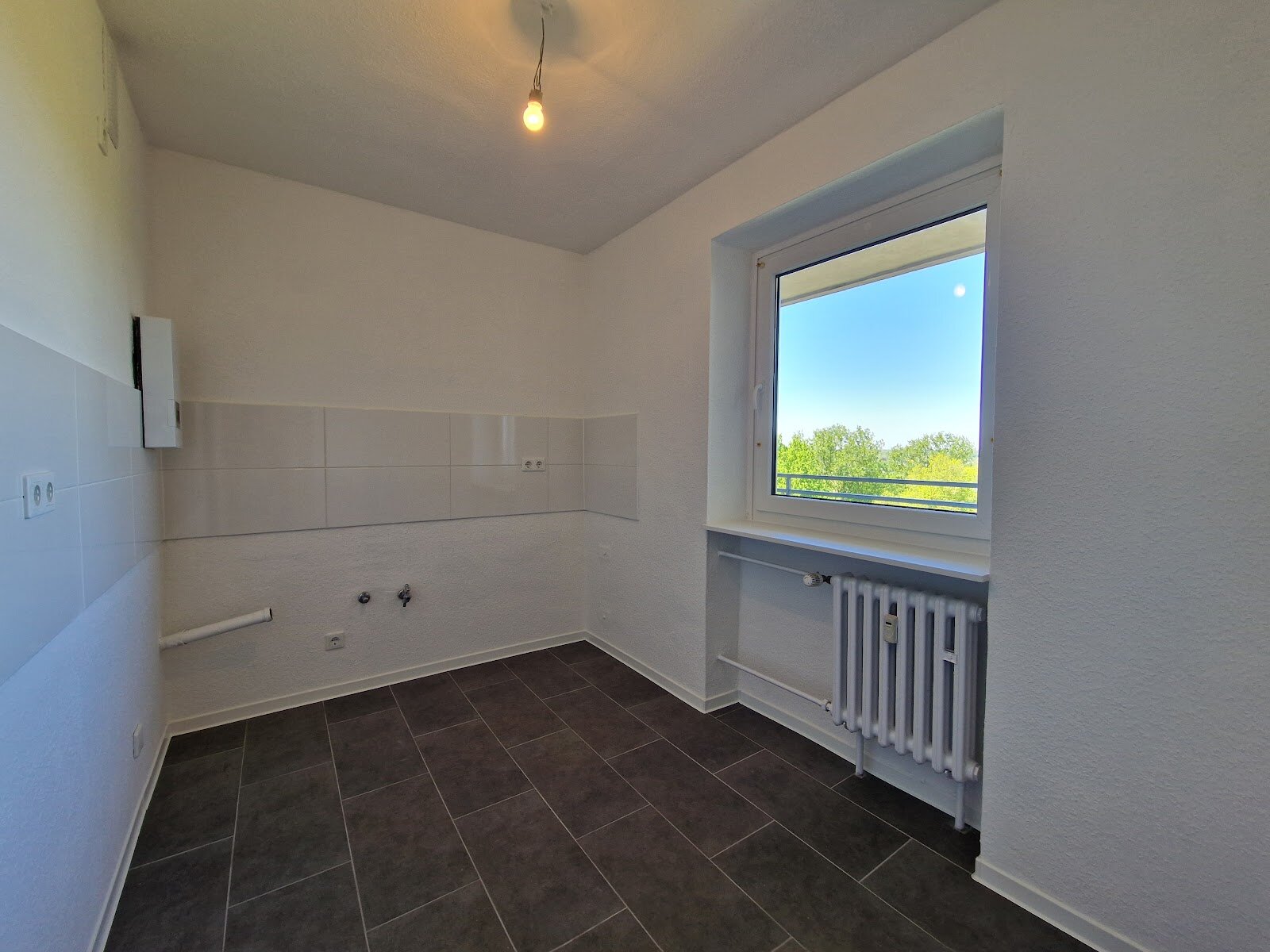 - Anthrazite Boden- und weiße Wandfliesen in der Küche