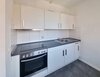 - Anthrazite Boden- und weiße Wandfliesen in der Küche