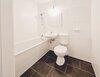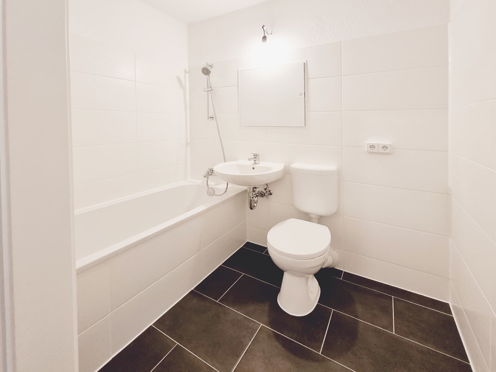 - Anthrazite Boden- und weiße Wandfliesen im Bad