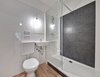- Vinyl- Bodenbelag und weiße/ graue Wandfliesen im Bad