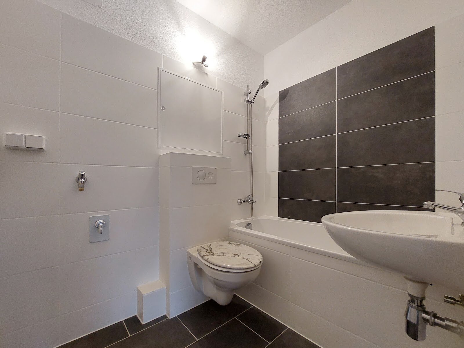 - Anthrazite Boden- und weiße Wandfliesen im Bad