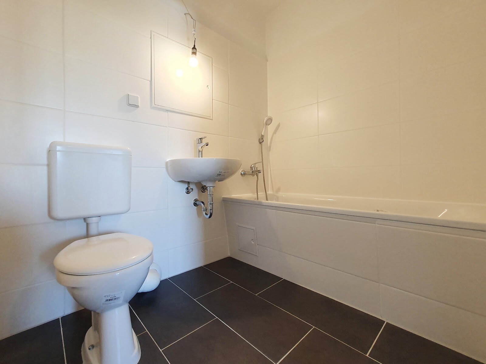 - Anthrazite Boden- und weiße Wandfliesen im Bad