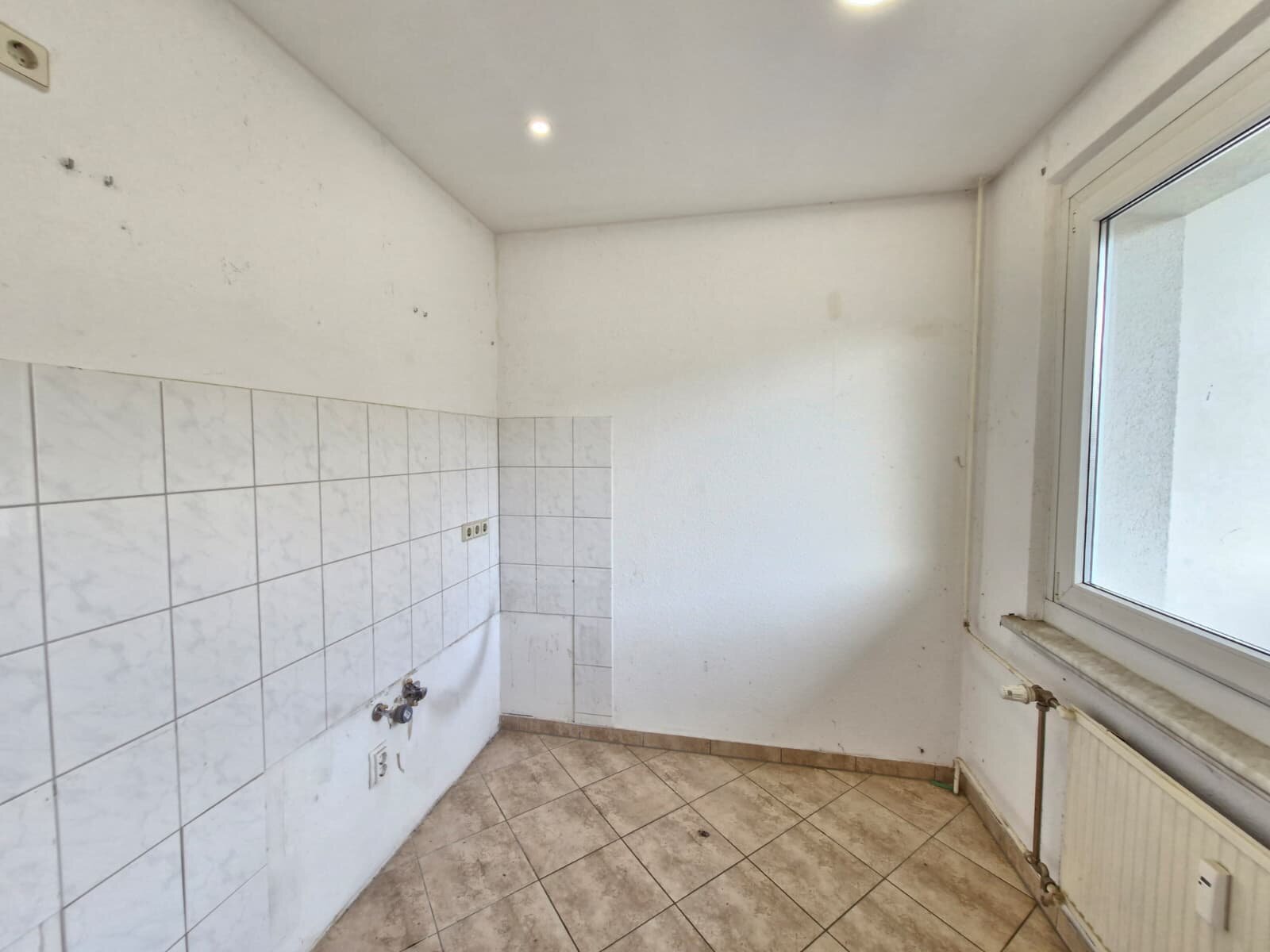 - Anthrazite Boden- und weiße Wandfliesen in der Küche (nach erfolgter Renovierung)