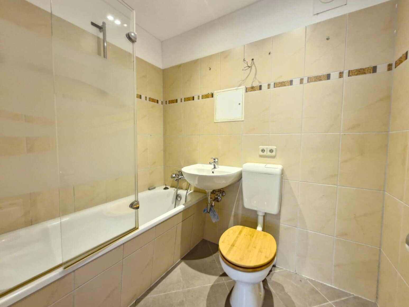 - Anthrazite Boden- und weiße Wandfliesen im Bad (nach erfolgter Renovierung)