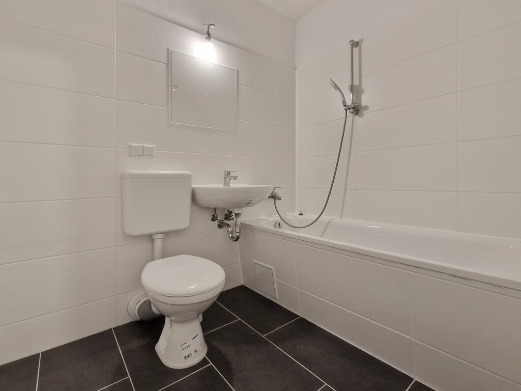 - Anthrazite Boden- und weiße Wandfliesen im Bad