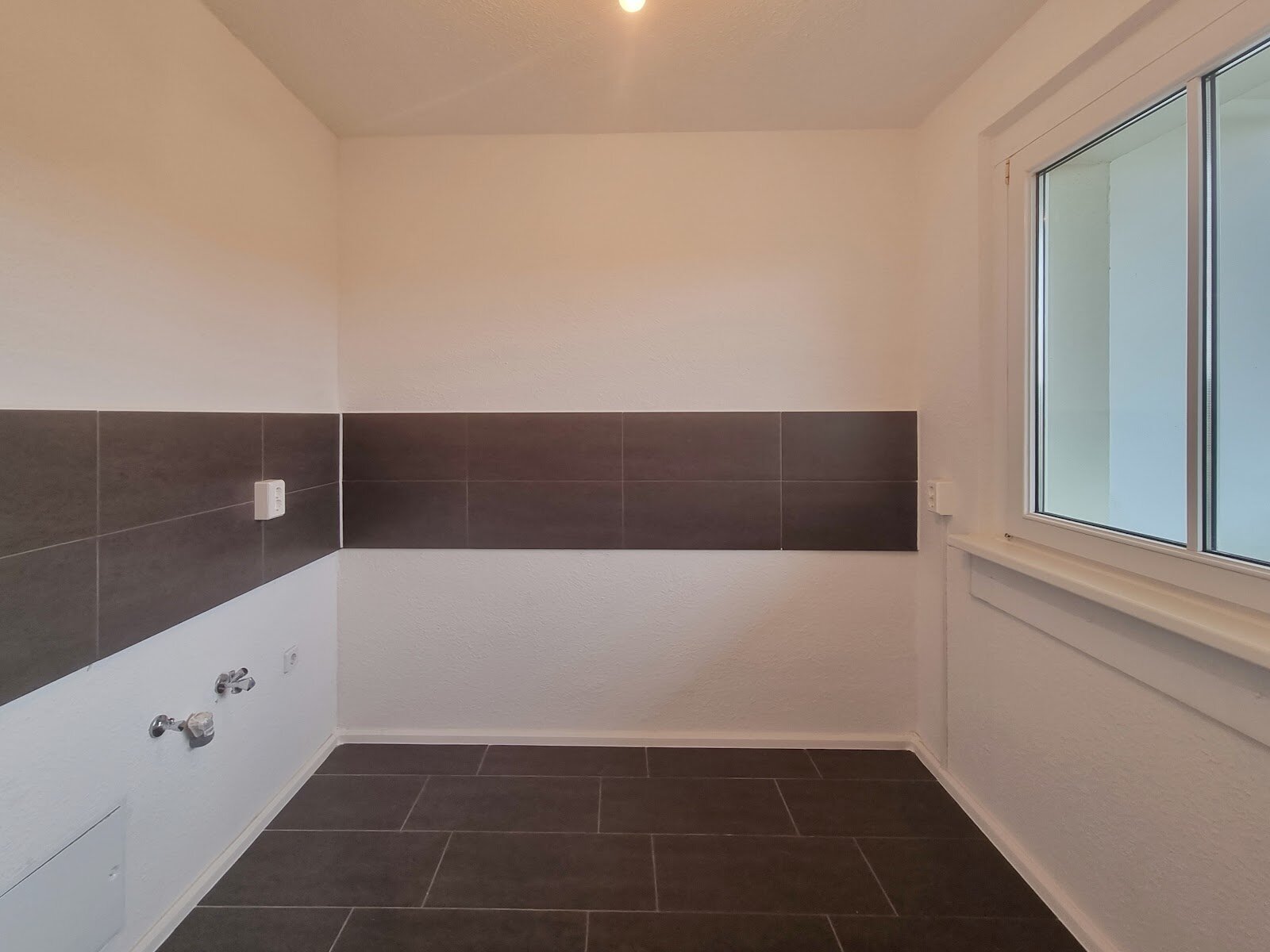 - Anthrazite Boden- und Wandfliesen in der Küche