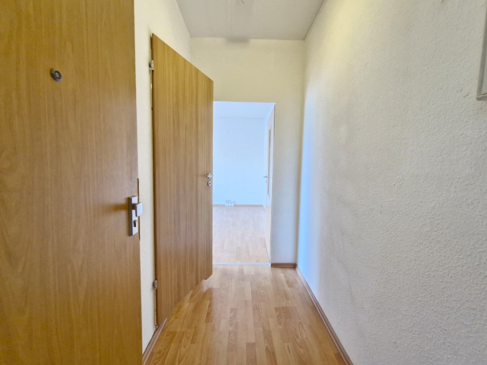 - Laminat- Bodenbelag und Raufasertapete in den Wohnräumen