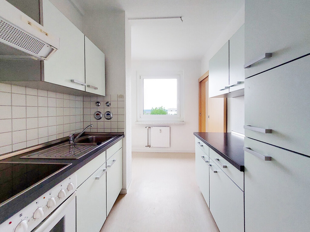 - PVC-Bodenbelag und helle Wandfliesen in der Küche