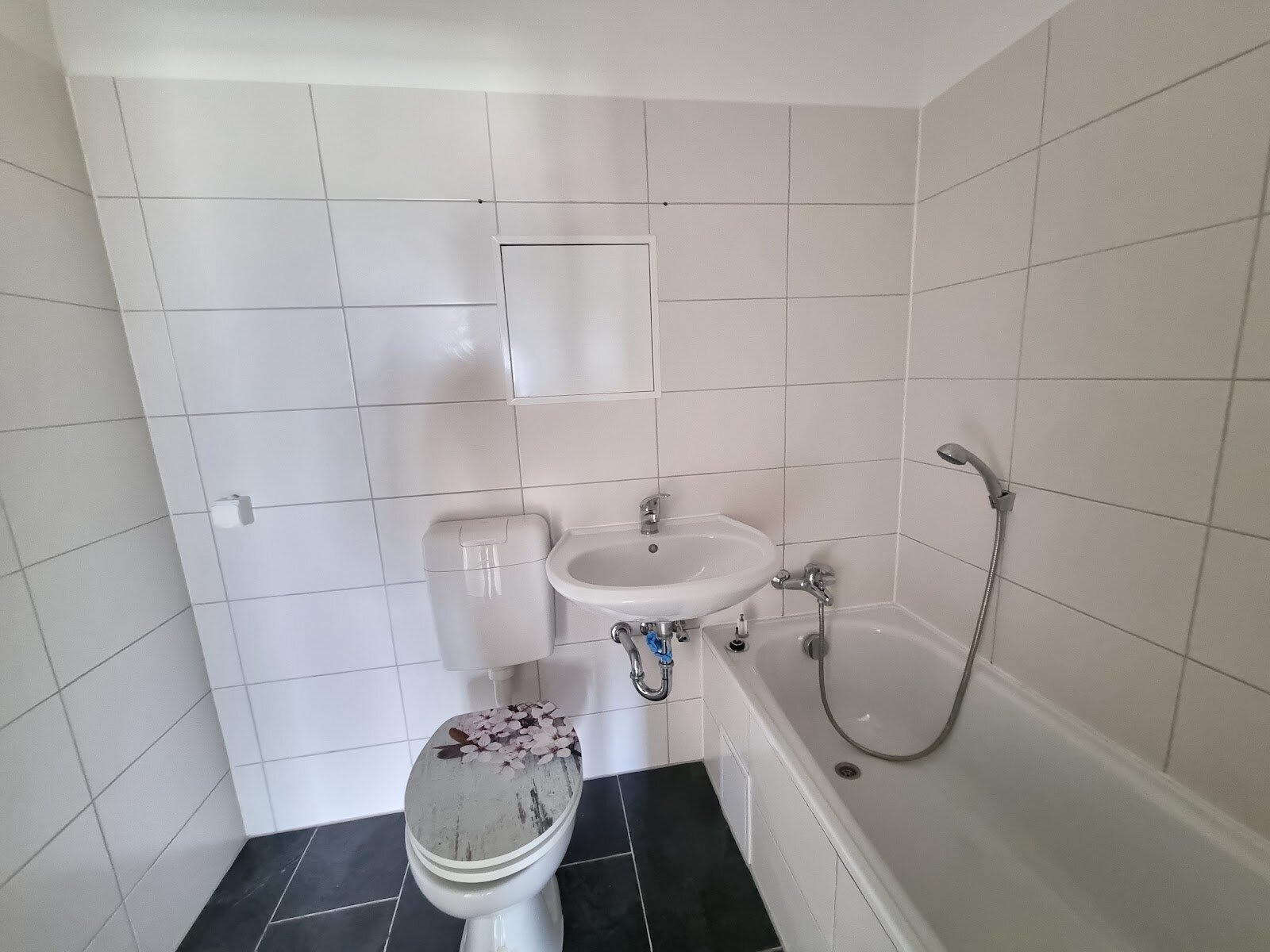 - Anthrazite Boden- und weiße Wandfliesen im Bad