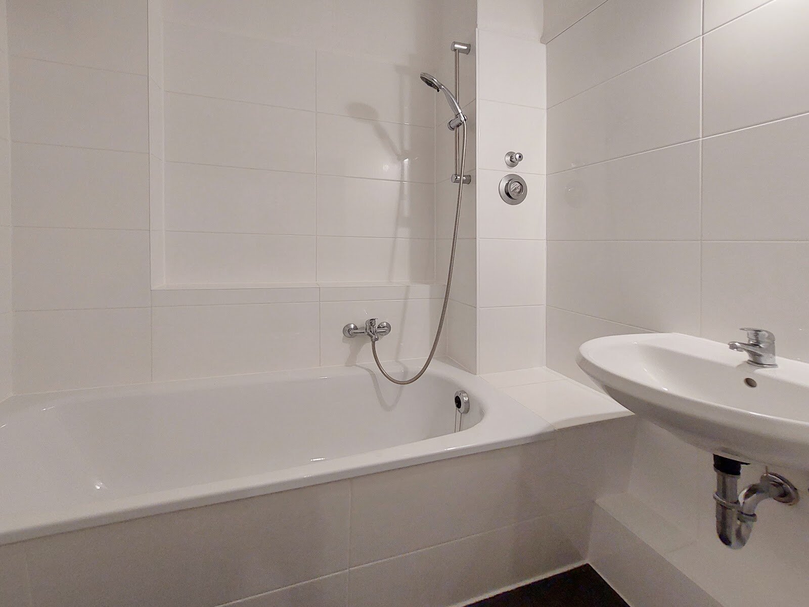 - Anthrazite Boden- und weiße Wandfliesen im Bad
