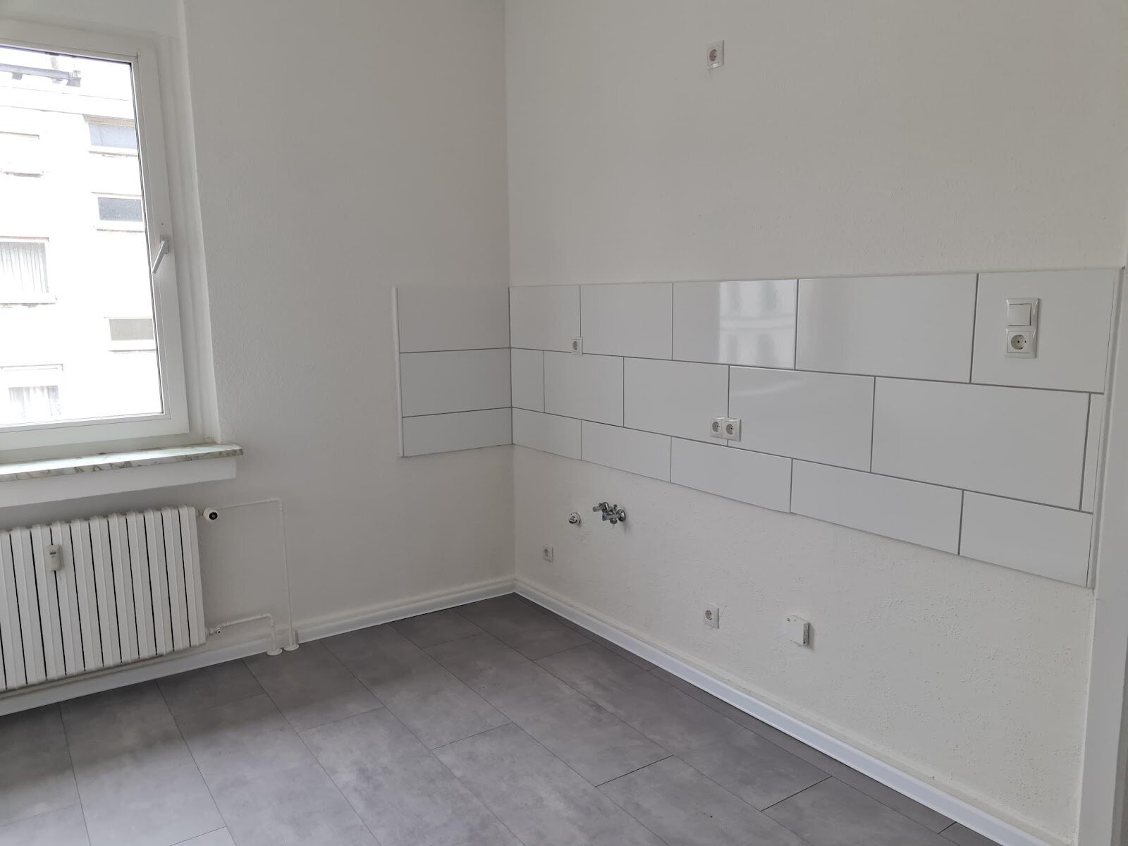 - Anthrazite Boden- und weiße Wandfliesen in der Küche