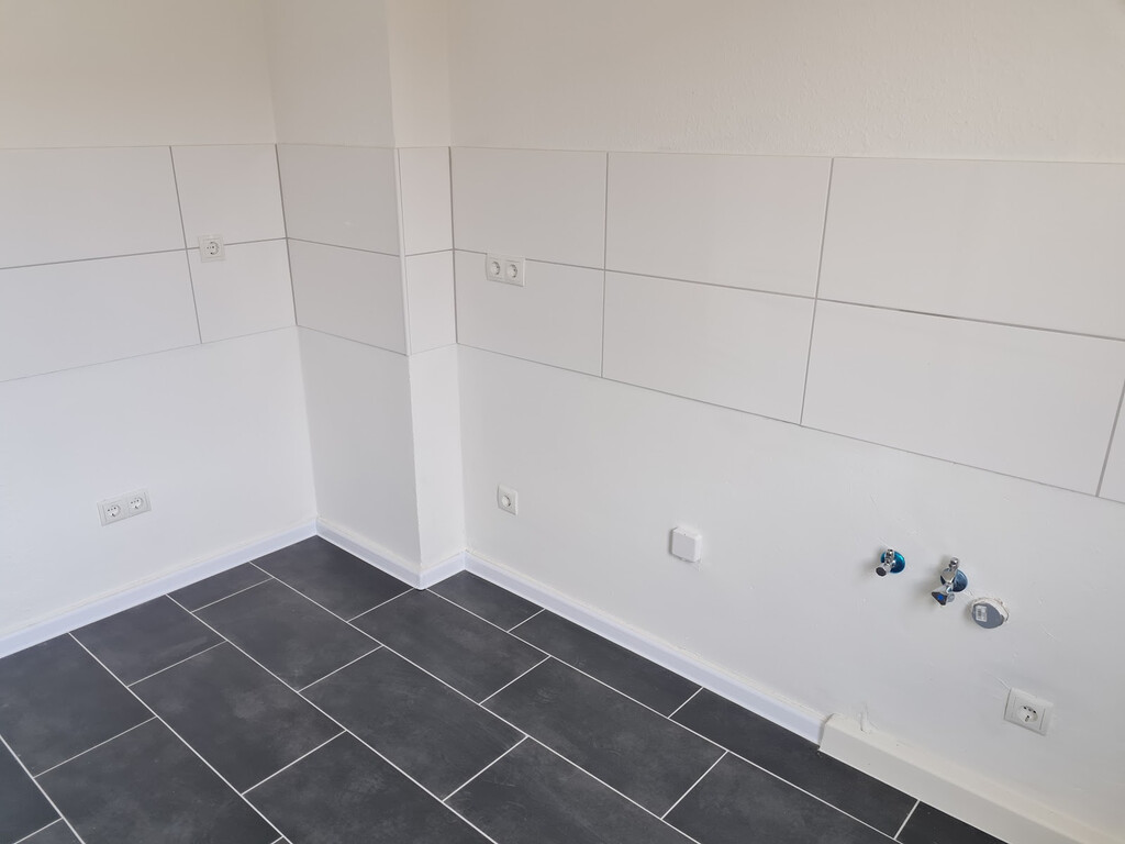 - Anthrazite Boden- und weiße Wandfliesen in der Küche